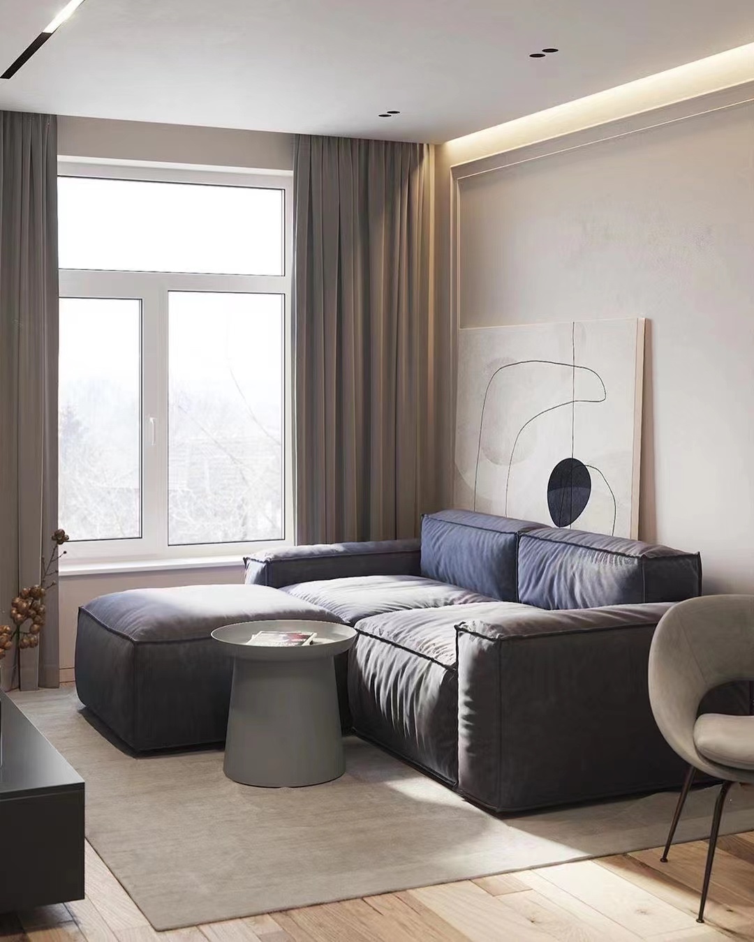 整体的色调选择了自己最喜欢的灰色调在做了简单的茶几做搭配