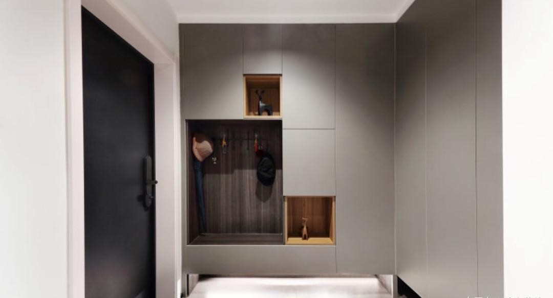 玄关承担着家庭中大多数杂物收纳功能,结合户型组合定制玄关柜,完成基础收纳功能。 配色则是利用整体肤感灰柜体,搭配局部暖色原木开放格,进一步融合灰色带来的沉闷感,彰显质感时显得更加灵动。