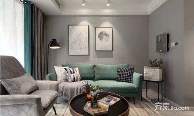 客厅,石纹地砖加铺地毯,灰色背景墙装点简框画,点光源制造视觉层次感