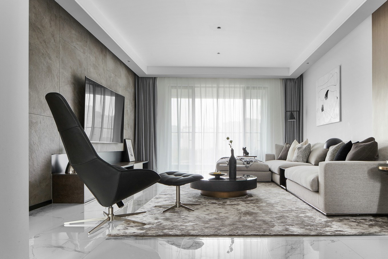 光线透过宽大的落地窗照耀在墙地面上,整个空间清净明亮;无主灯设计,软装硬装丰富,轻奢的感觉油然而生~