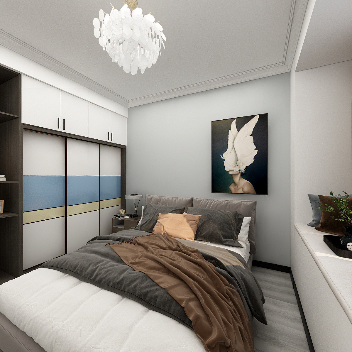 主卧空间不大,柜门选用推拉门,方便放取衣物,木地板选灰色的木地板,床头背景墙用的调色乳胶漆,挂画点缀空间。