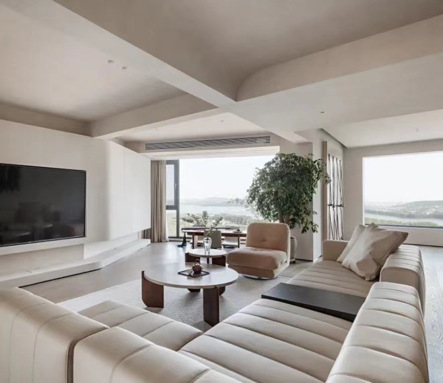 步入室内,映入眼帘的是清雅之势,大面积的落地窗外将远处东湖山水风光拉进室内,自然光也通过落地窗倾污而入,给人无需多言的柔软和舒适,辅以大面积的“白”,静谧之意油然而生。客厅采用嵌入式电视与墙面融为一体,并延伸出一整面的收纳柜,悬空的地台呼应上下,进一步增强这种连续性。裸露的梁结构在空间维度充斥着张力和纵深感.表现出的粗粉和周围的细腻形成对比。