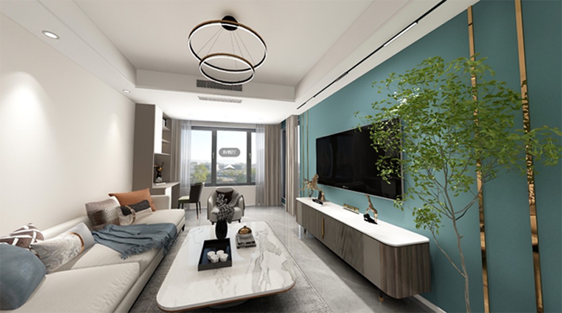 客厅双眼皮边吊非常大气,电视墙的跳色搭配金属线条,顶部磁吸轨道灯打在电视墙上更显质感