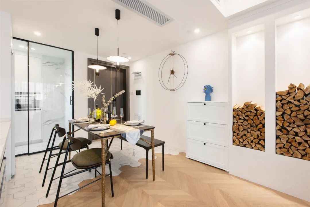 将入户处的鞋柜外置。玄关处采用六边砖,用金色涂料做美缝处理。由清新的鱼骨拼木地板巧妙地过渡,划分不同功能区。