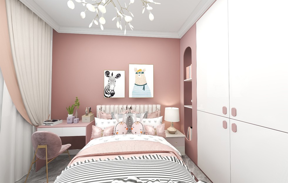 儿童房以粉色为主,俏皮的衣柜设计,彰显活力,窗帘的配色也为业主的女儿打造出温馨舒适的公主房。