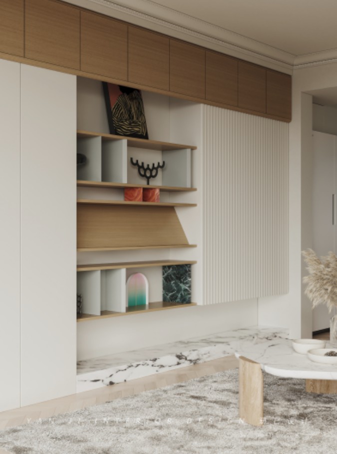 地台划分出客厅和卧室,用石膏线木制品造型美观的沙发,提升丰富感和层次感