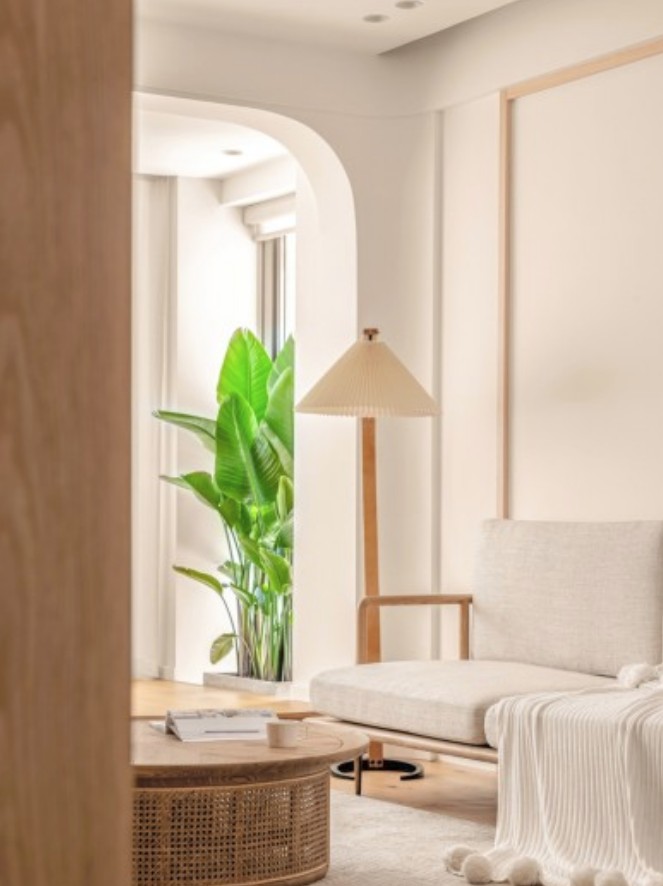 电视背景墙被整墙书柜取缔,这里是琳琅满目的藏书的新家;原始客厅光线不利阅读,设计师取消阳台门,让客厅更大、进光面更开阔,无遮挡的自然光更柔和均匀地照亮空间。
