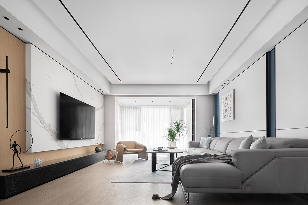 鱼肚白纹理搭配原木纹肌理的电视背景,线性与立体感跃然而出,让空间更具温雅艺术。
