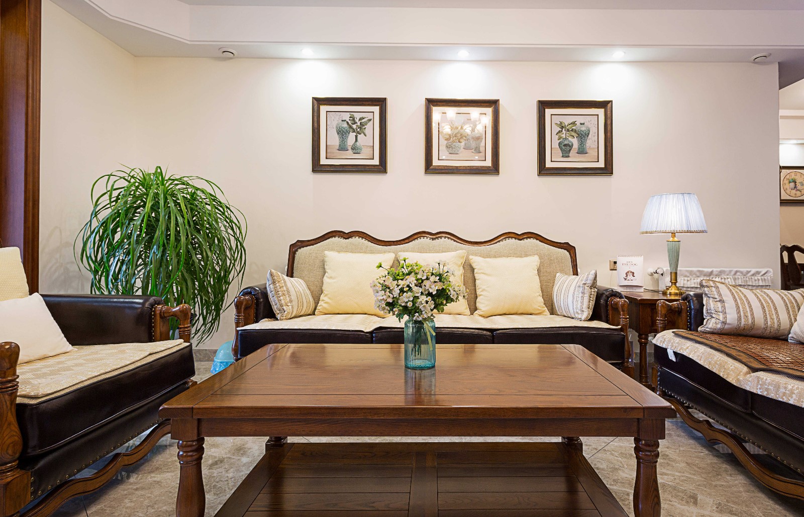 客厅大理石的瓷砖,沙发的摆放以及上方的吊灯都符合了美式风格该有的气质已经特点!茶几也是采用了木质的元素,没有太多的花里胡哨。客厅的绿植也非常的美观实用,电视柜也是一样采用了木质,尽显美式风的古典大气!