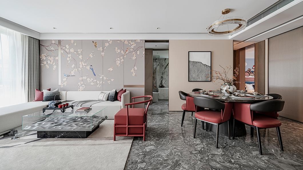 卧室以灰白黑中色为主,故宫红作为辅助让古朴的中式意境透漏出婉约温柔的气质。