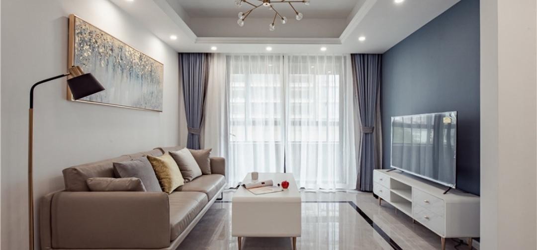 暖调的基础配色 蓝色墙布做电视背景墙 布艺的质感消解了冷调属性 让空间依旧温柔并保证清爽