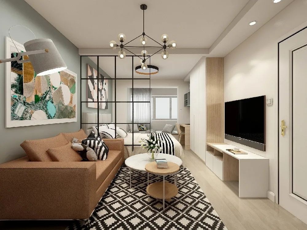 因为空间的局限性,就将卧室和客厅融合在一个空间里的同时,又用一道玻璃架子将两者分开