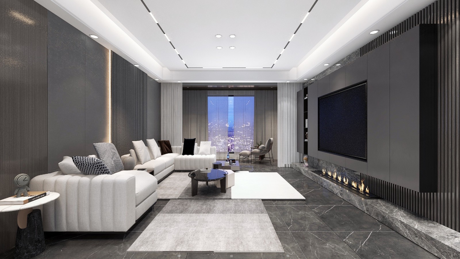 现代轻奢风格全新装修, 整体灰白色系的基础色,白色外观,带有金属色的细节墙面装饰