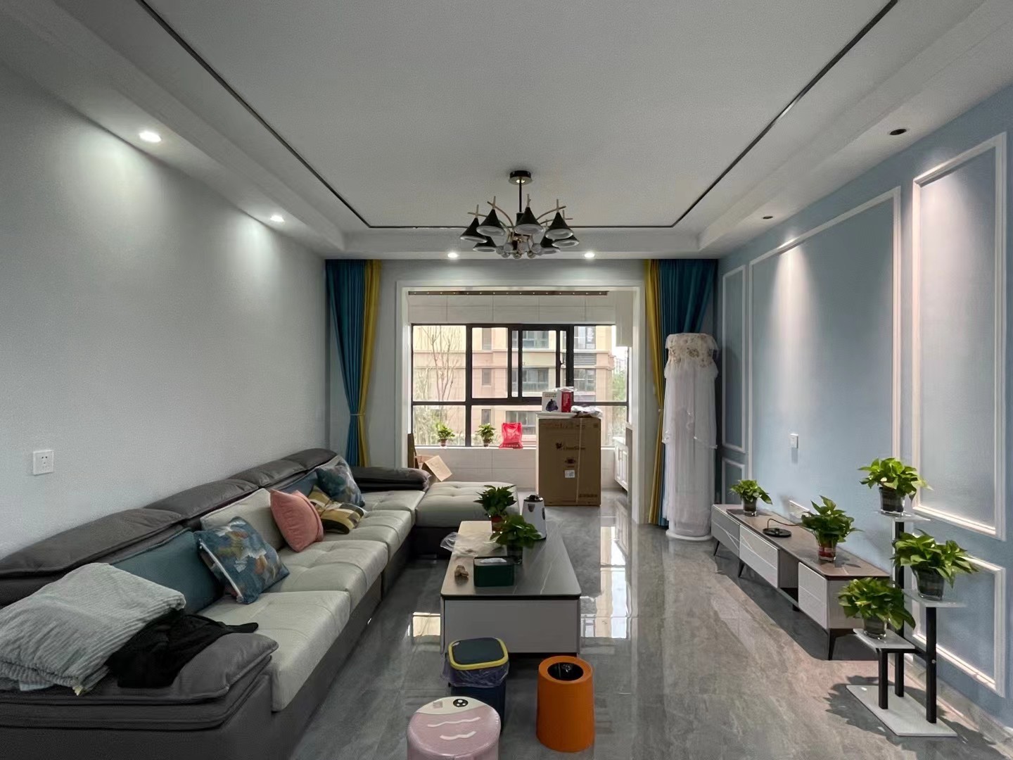 沙发后的拼色墙面和石膏线条是最美的风景