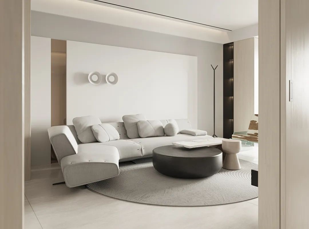 全屋采用无主灯设计,拉伸层高。浅色墙面携大块地砖,与窗外光源产生联动,为区域营造通透与大气。选配浅灰沙发,低调而优雅,磨砂黑茶几干练沉稳,摒弃喧宾夺主的姿态,为清爽色调装点时尚感。