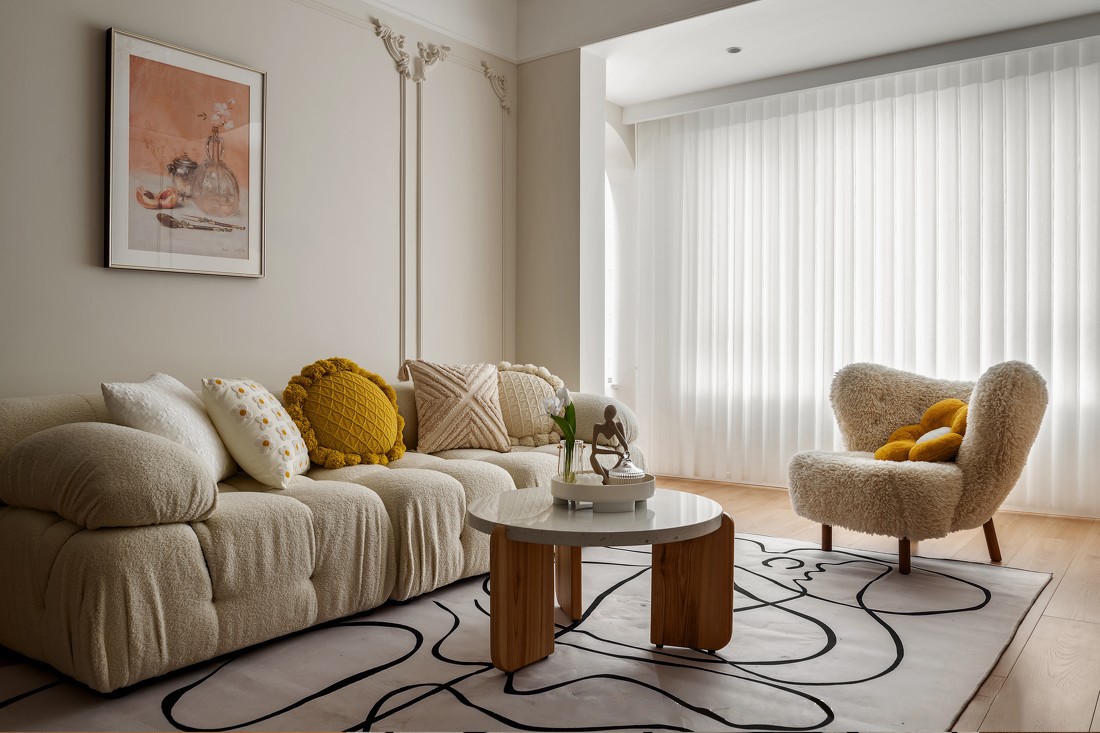 墙面的法式纹理配合着奶油色墙面和毛茸茸的沙发,在法式浪漫中更显温馨柔和。