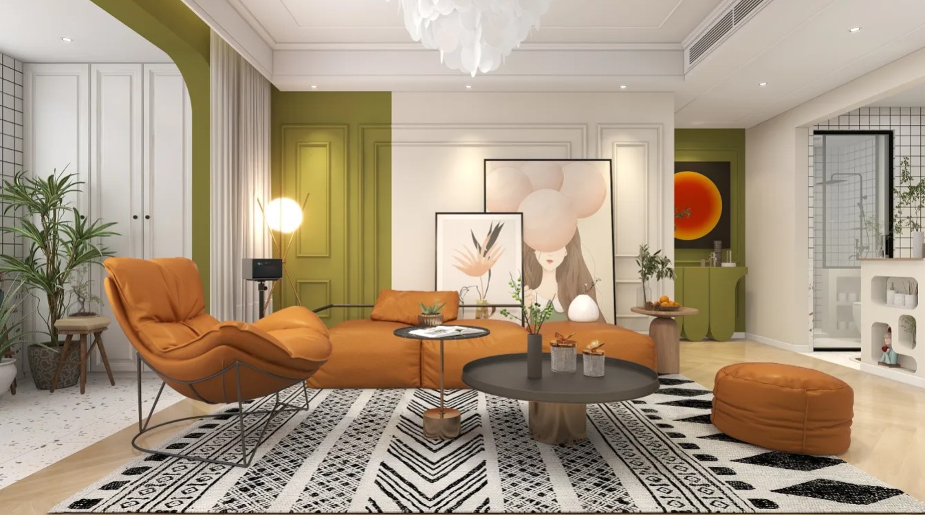 和客厅一体的颜色搭配撞色