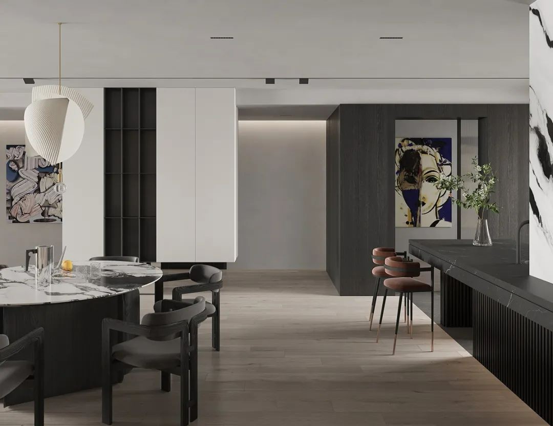 罗列空间模块再组合,巧用空间线面关系,丰富三维视觉美感的同时,亦是带有极富生活化的务实收纳功能,于玄关吊柜处、于客餐侧墙处,填以线条、格口的开放展览空间为实用功能加添艺术情致。