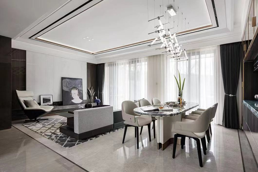 本案以“听风 · 入静谧,出繁华”为设计主旨,把设计交还他们的生活。 设计中的“奢华”不止来源于材质***,更是洞察生活的本质,让居住者感受到经典适意与前卫艺术并存的生活场景。 它依然带有奢华的风骨,并在传统与现代间折射出雅致随性的平衡,为有限的空间注入更多生活内容和想象的价值。