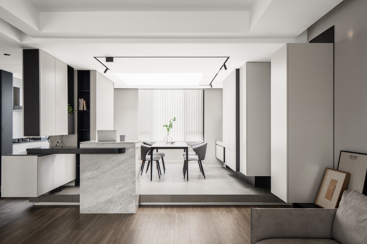 床对面是一溜书桌,两旁做深色书柜,墙面灯槽发出舒适的光感,让大白墙也有不一样的面貌。