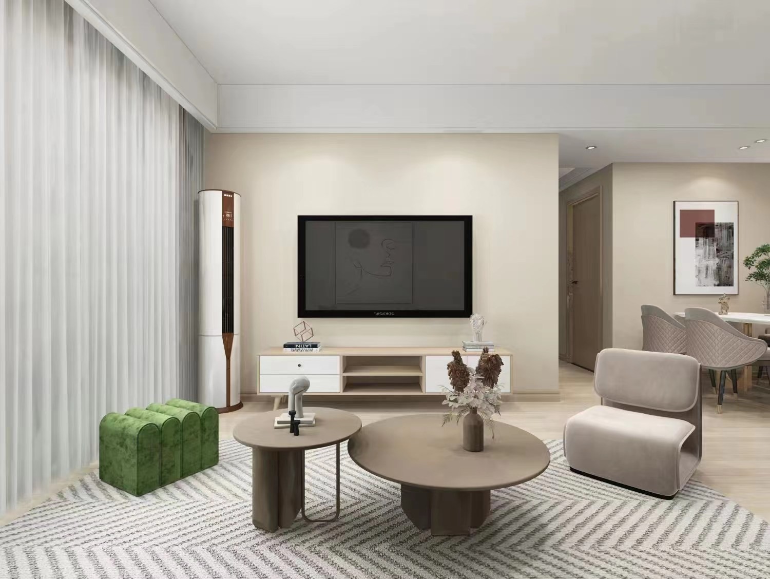 客厅采用淡黄色为主色调,制造奶油感,家私搭配相近色