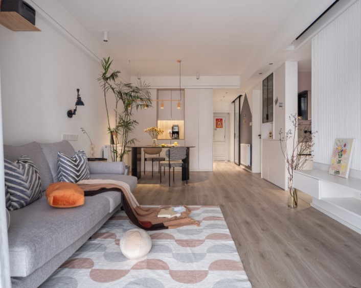 没有过多的装饰,原木地板和简约的布艺沙发呈现出温馨舒适的环境。客厅的灯光是用的防眩晕的射灯和线性灯,营造出有层次感的空间。