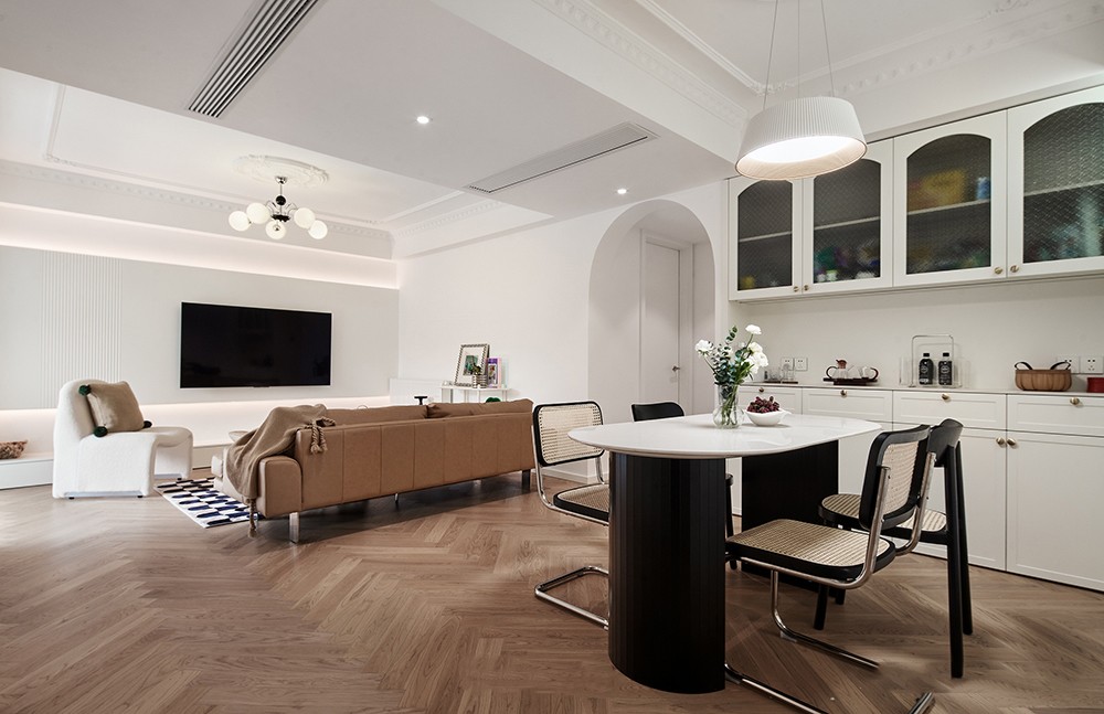鱼骨拼地板错落交织与编织藤条座椅相呼应,呈现出自然舒适且自由的用餐空间。