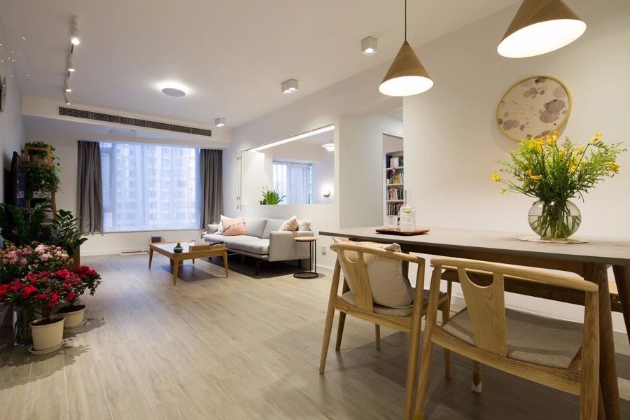搭配原木家具及绿植,加上无主灯设计,简单而富有生气。