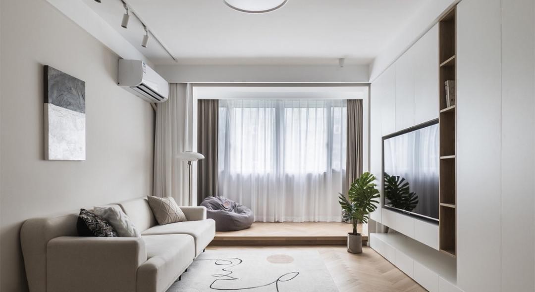 有着近4米的整排电视储物柜,有藏有露的收纳以及悬空设计,让空间不再单调;