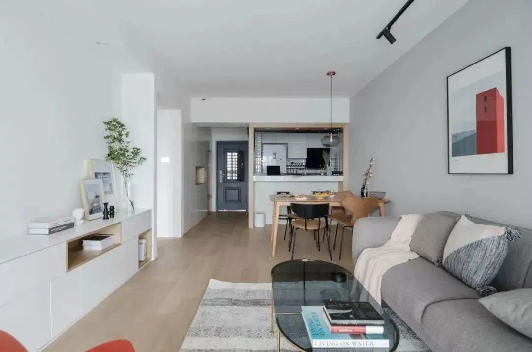 进门右手边打造整面墙收纳,柜体从入户一直延续到客厅,兼具鞋柜和储物柜功能,也有视觉引导的作用。进门处做凹龛,坐下可以换鞋,下面放置常穿的鞋子。