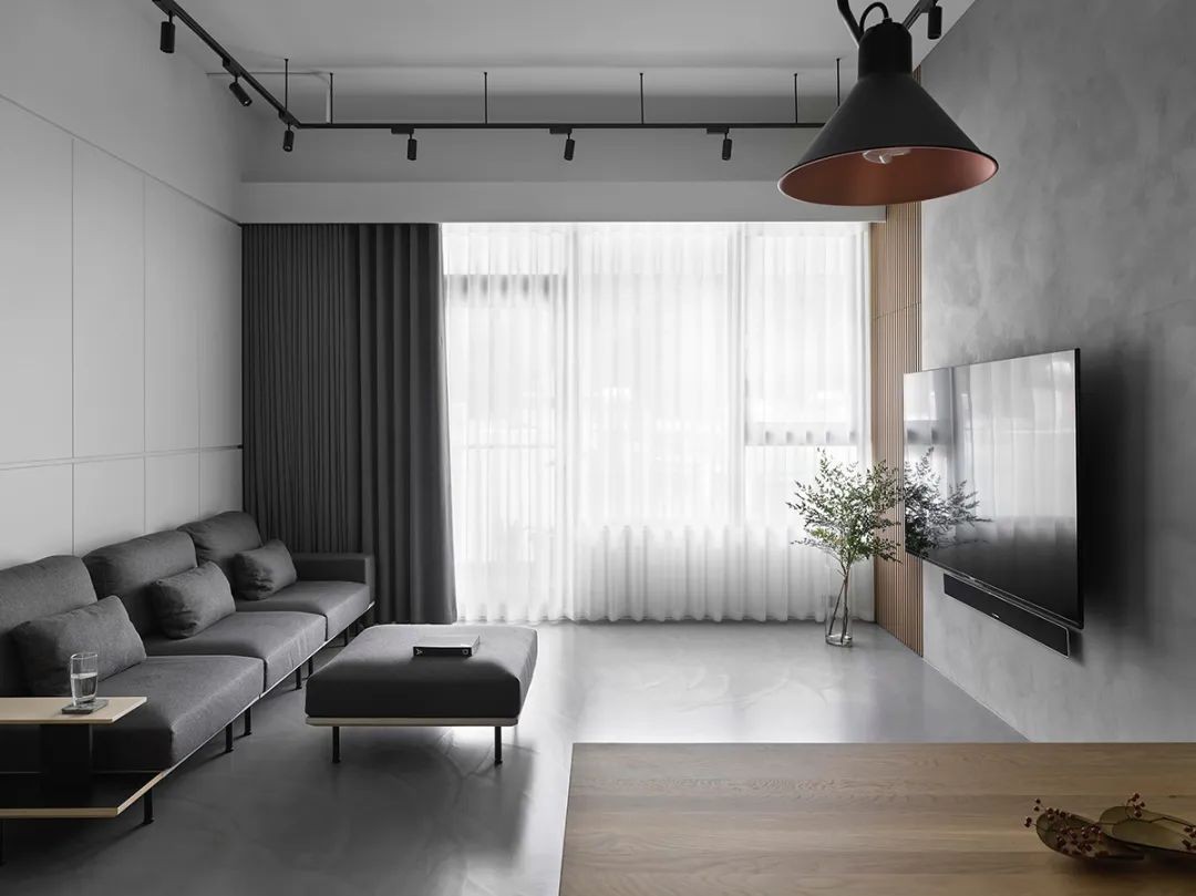 为地板披上一层淡淡灰阶,无缝地向家的深处延展视线即从大门展开,瞬间收进家的全景。
