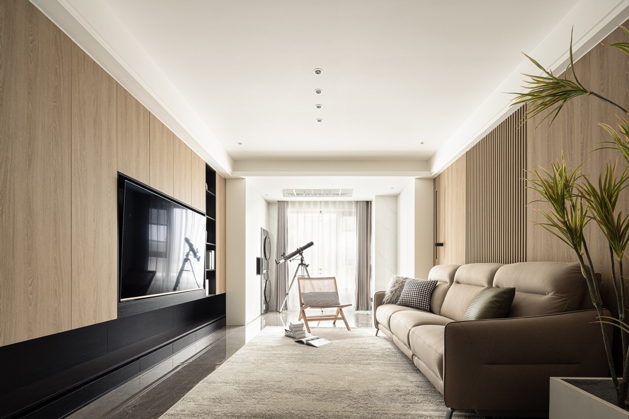 柜体式的电视墙,储物隐藏,灯光点缀, 四季为景,笑谈日常, 一个家的美好不过如此..