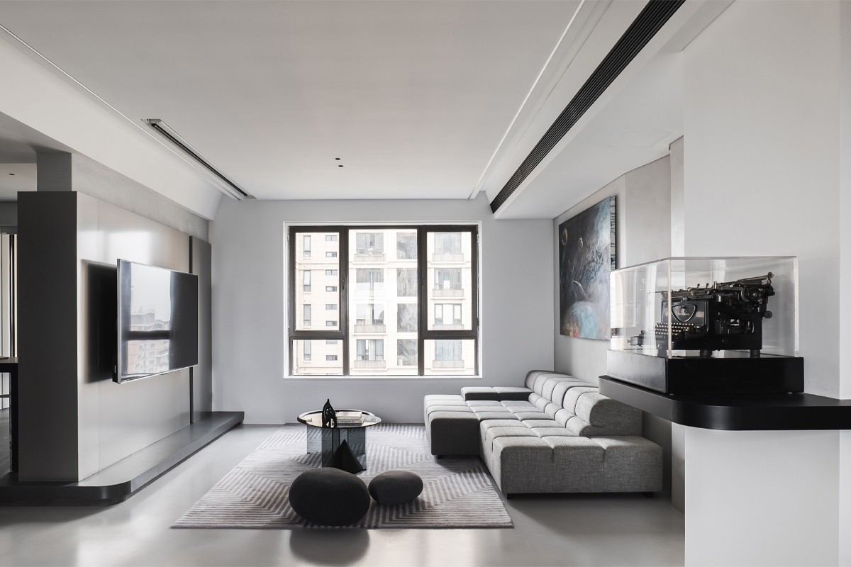 穿过玄关来到客厅,规整利落的线条,勾勒出空间的简约气质。屋主要求不拆除整屋原来的地砖,表面附磐多魔,水泥的冷冽质感,正好契合女主人喜欢的冷调。