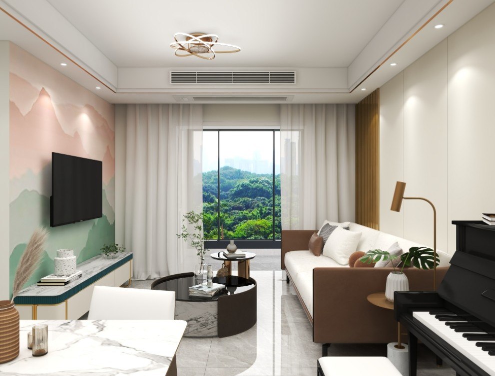 电视背景墙,运用山水的造型,加一点中式的颜色,沙发也是属于新中式的造型,浅灰色的地砖,整体是属于中式加简约的风格