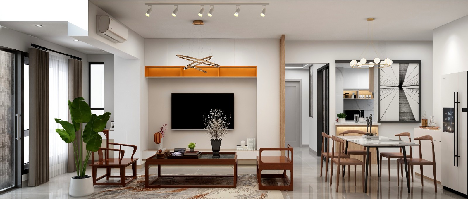 沙发背景墙一侧设置暖光灯槽,柔化空间棱角的同时,也让整体空间更加丰满。