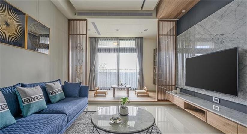 客厅与和式书房,在选购家具时,也从相近的元素为基底而挑选,象是客厅的茶几,以石面衬铁件桌脚,都为全室点缀了静谧与雅致。