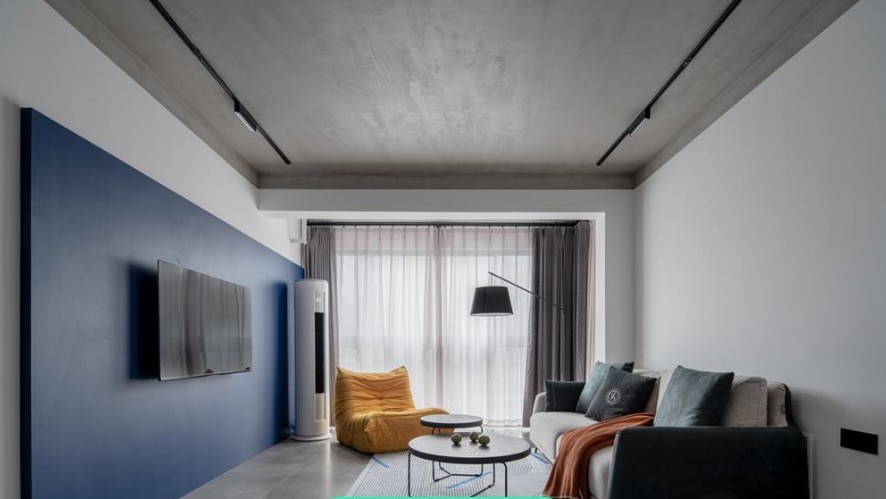 客厅以大面积的白+灰为基调,深灰的墙面搭配上蓝色的背景墙,灰色地毯和墙顶相 互映村着,看上去极为简约,带有一种神秘气息。而蓝灰两色的协调,让空间也不至于大过 令淡。局部色搭配软装的鲜明色彩让整个空间更具视觉张力。