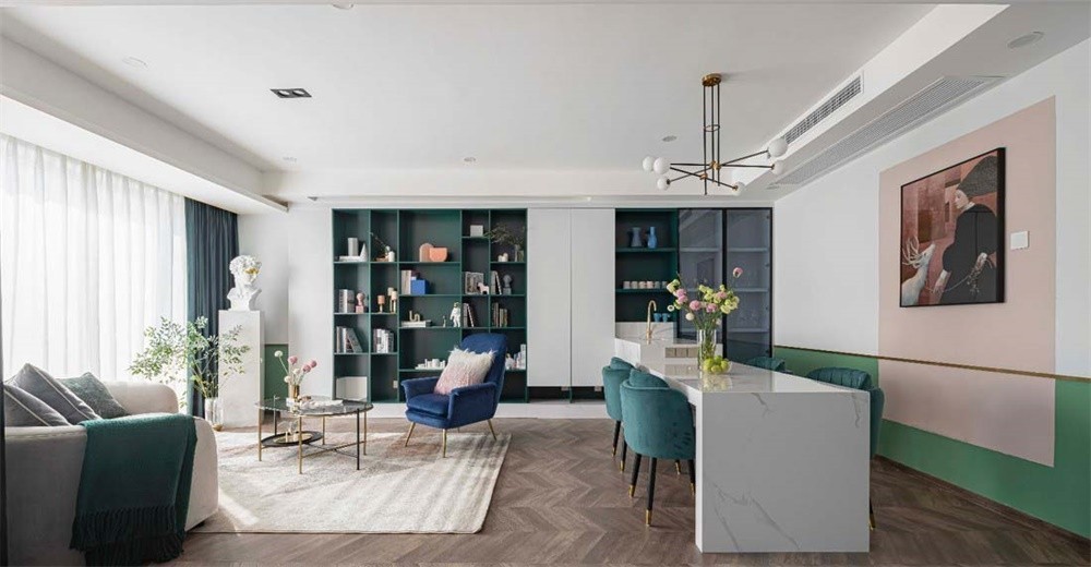 两道长虹玻璃折叠门,构筑了整个家的开放格局,打破公共空间和私密空间的界限。当门打开时,客厅、餐厅、书房形成一个超大开敞空间,特别适合全家一起休闲娱乐交流