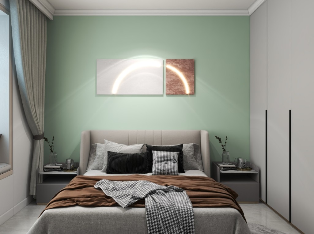 这个是主卧的卧室背景墙,用的是一个绿色的漆,整体是比较和谐的