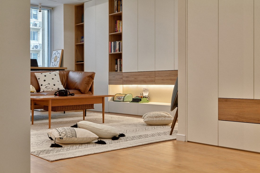 温润的木感,承载灵活的挂置功能。那一抹姜黄促使情感升温,地面和墙面相互呼应,观之舒适,心中欢愉。