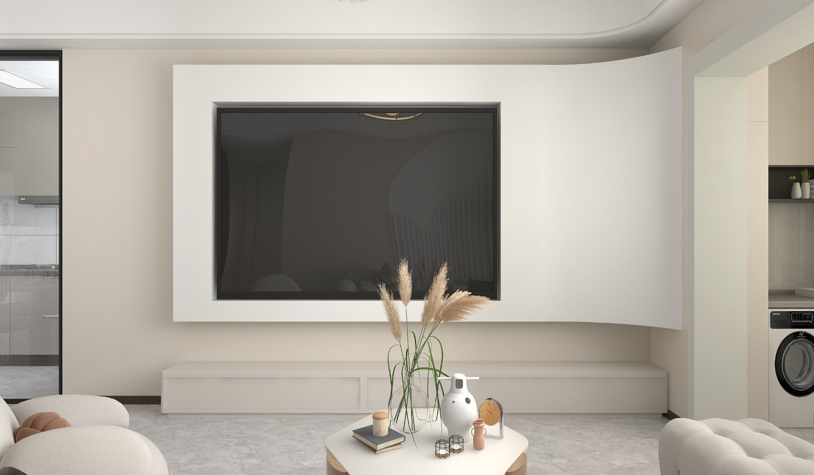 整体颜色以暖白色为主搭配有弧度的电视墙