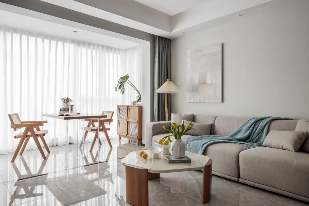 客厅摒弃了繁杂的装饰,简约的灰色布艺沙发搭配木质组合的茶几,各类温和的材料融合在一起毫无违和感,空间散发着自然的气息。