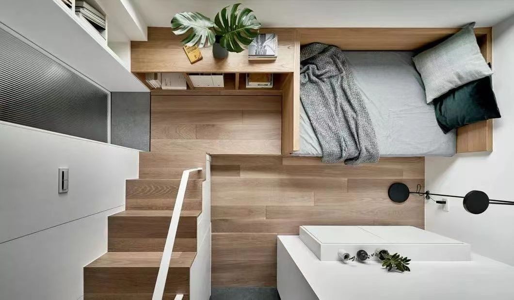 由于夹层卧室没有站立高度,因此衣柜被整合到了公寓的入口通道位置,其他储物柜利用楼梯下方和浴室门上方的每一寸空间。