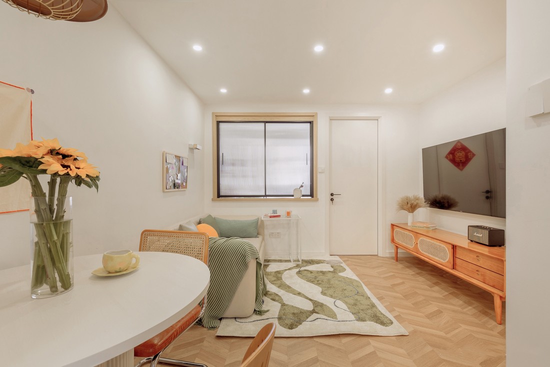 客厅整体是以白色和原木色为主的浅色系,地板选择的是仿鱼骨拼纹理的直拼地板,节约了造价的同时更加的环保。