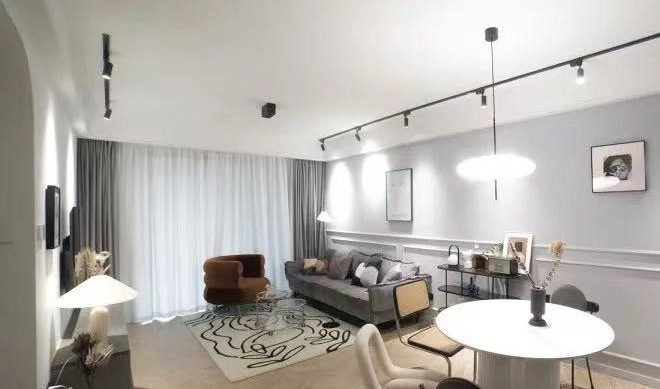 客厅厨房打通以后采光问题好了很多 灰色沙发与浅灰色背景墙相得益彰