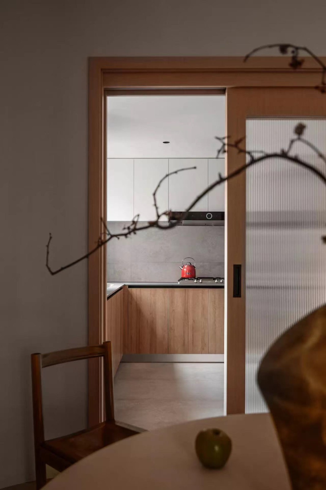 餐厅与厨房紧密相连 区域之间以木框长虹玻璃门推拉门相隔 平日可以敞开 采光与视觉面积会增加很多
