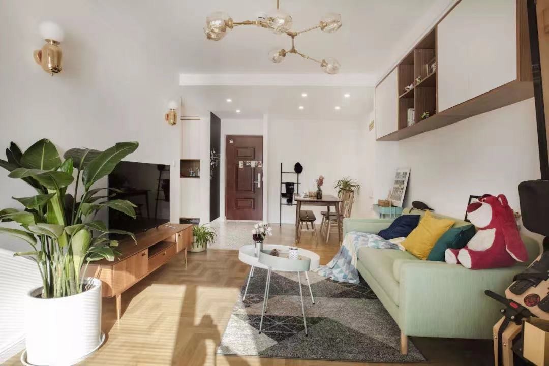 整个客厅空间不算很大,整体以白色为主的空间,搭配简洁的软装和绿植显得更加惬意。电视柜搭配沙发背景墙的吊柜,也能满足客厅的收纳需求。