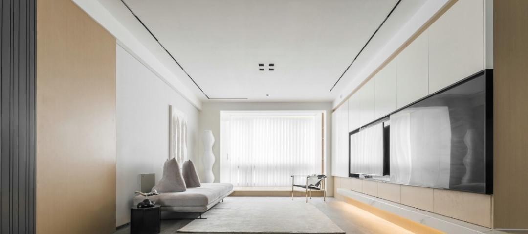 石材和木饰面的设计从玄关延伸至客厅,既给空间增加了美观性,又可以增加储物;