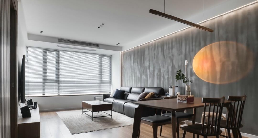 因为精装房地面铺的是地砖,屋主比较喜欢木色元素,所以本次改造在上面直接铺了木色地板,还可以给空间增加温馨感;沙发背景墙选了水泥漆处理,四周设计了线性灯带;