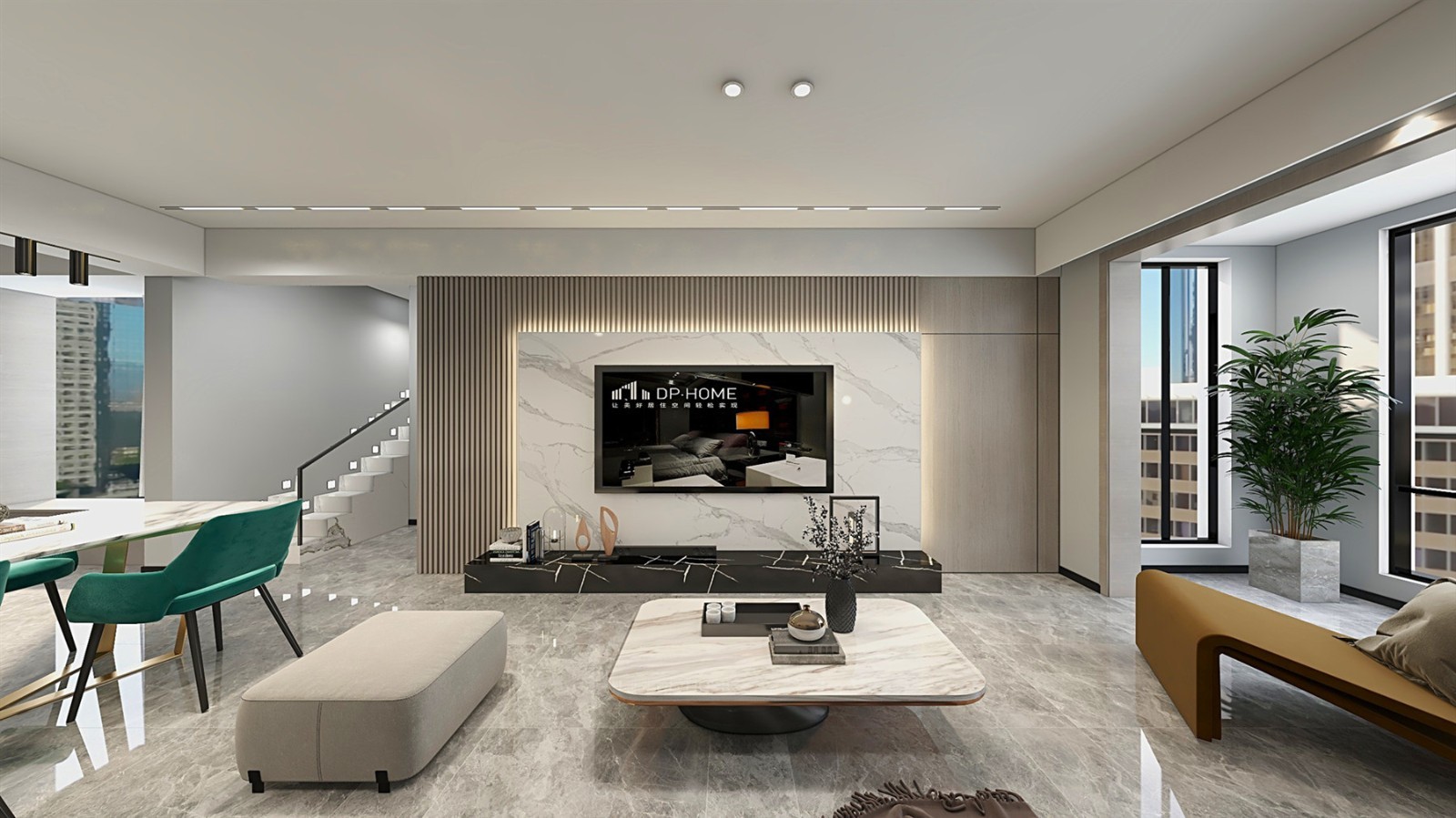 墨绿色的餐椅点缀了整个空间,格栅设计背景墙显得更有质感